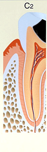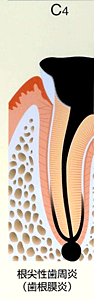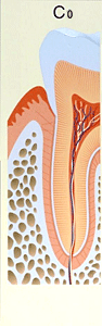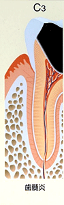 | 症状 | むし歯が歯の神経(歯髄)まで進行しています。歯の痛みをかなり感じる状態です。 以前に治療を受け神経を抜いてしまった人や、むし歯が進行して 神経が死んでしまっている場合には歯の中に細菌感染を起こすと 歯根の周りが膿んでしまう可能性がある危険な状態です。 |