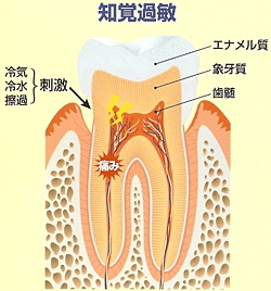 エナメル質の中にある象牙質がむき出しになります。すると冷たい物などの刺激が歯の神経に伝わり、